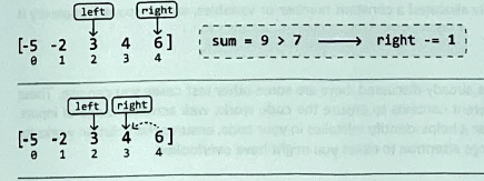Now, the sum (9) is too large. We should decrement the right pointer to find a pair of values with a smaller sum: